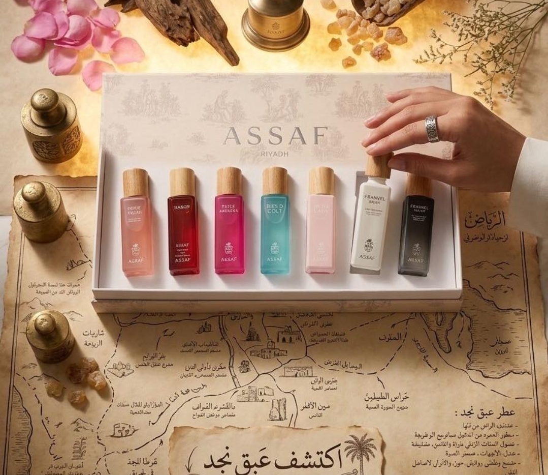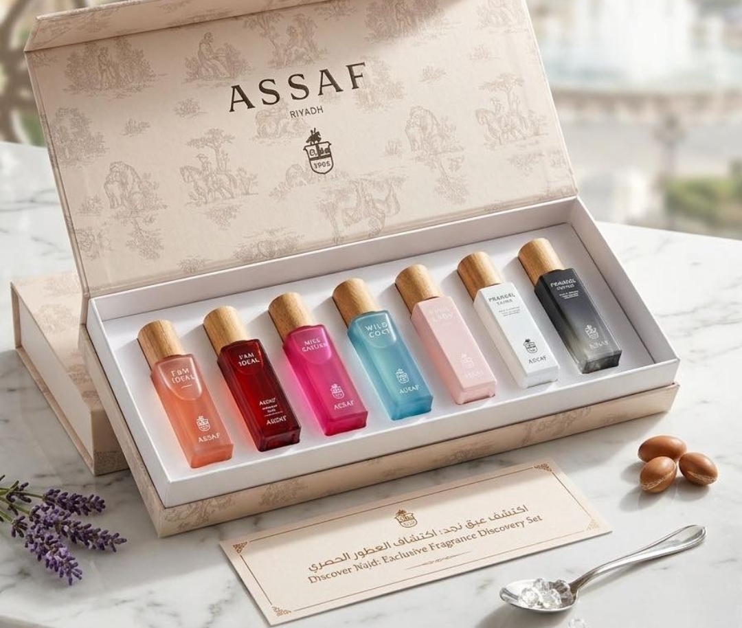 (Assaf Perfume Mini Set) ، وهي عبارة عن بكج يحتوي على عدة عطور ملونة بحجم السفر، مصممة لاستكشاف روائح العلامة التجارية المختلفة.